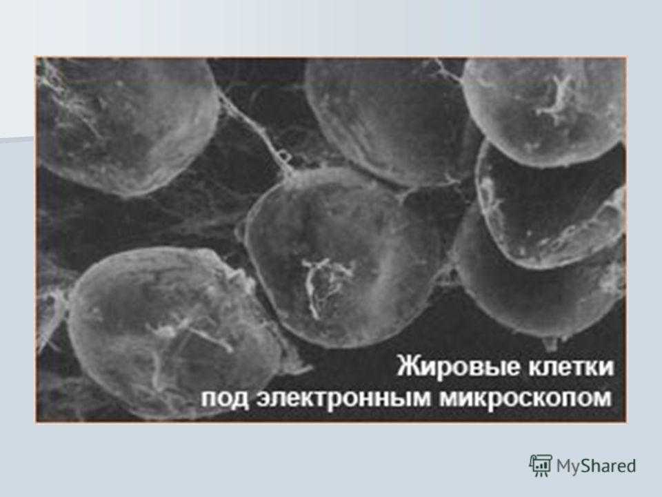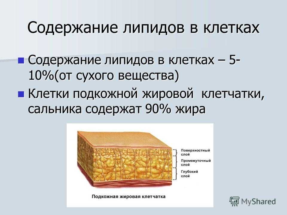 Содержание липидов в клетках Содержание липидов в клетках – 5- 10%(от сухого вещества) Содержание липидов в клетках – 5- 10%(от сухого вещества) Клетки подкожной жировой клетчатки, сальника содержат 90% жира Клетки подкожной жировой клетчатки, сальника содержат 90% жира