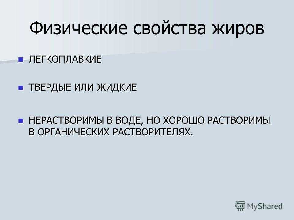Физические свойства жиров ЛЕГКОПЛАВКИЕ ЛЕГКОПЛАВКИЕ ТВЕРДЫЕ ИЛИ ЖИДКИЕ ТВЕРДЫЕ ИЛИ ЖИДКИЕ НЕРАСТВОРИМЫ В ВОДЕ, НО ХОРОШО РАСТВОРИМЫ В ОРГАНИЧЕСКИХ РАСТВОРИТЕЛЯХ. НЕРАСТВОРИМЫ В ВОДЕ, НО ХОРОШО РАСТВОРИМЫ В ОРГАНИЧЕСКИХ РАСТВОРИТЕЛЯХ.