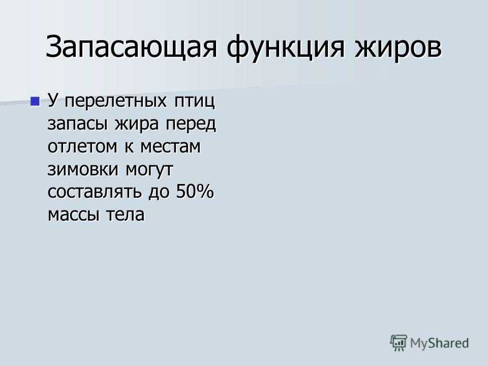 У перелетных птиц запасы жира перед отлетом к местам зимовки могут составлять до 50% массы тела У перелетных птиц запасы жира перед отлетом к местам зимовки могут составлять до 50% массы тела Запасающая функция жиров