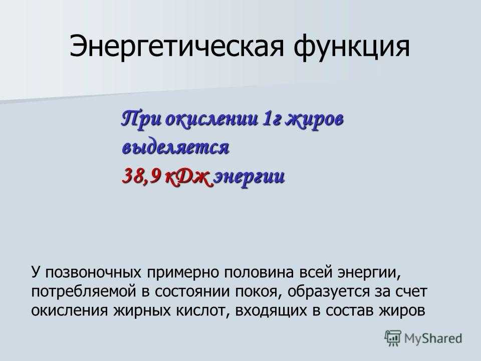 При окислении 1 г жиров выделяется 38,9 к Дж энергии Энергетическая функция У позвоночных примерно половина всей энергии, потребляемой в состоянии покоя, образуется за счет окисления жирных кислот, входящих в состав жиров