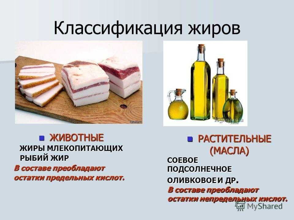 Классификация жиров ЖИВОТНЫЕ ЖИВОТНЫЕ ЖИРЫ МЛЕКОПИТАЮЩИХ РЫБИЙ ЖИР РЫБИЙ ЖИР В составе преобладают остатки предельных кислот. РАСТИТЕЛЬНЫЕ РАСТИТЕЛЬНЫЕ(МАСЛА)СОЕВОЕПОДСОЛНЕЧНОЕ ОЛИВКОВОЕ И ДР. В составе преобладают остатки непредельных кислот.