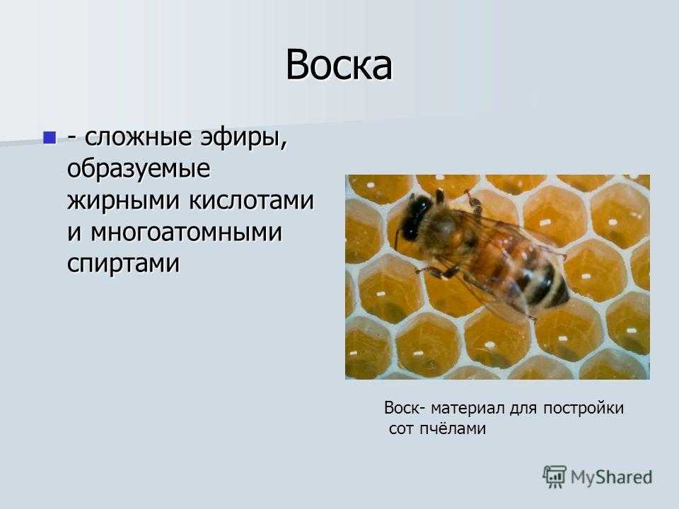 Воска — сложные эфиры, образуемые жирными кислотами и многоатомными спиртами — сложные эфиры, образуемые жирными кислотами и многоатомными спиртами Воск- материал для постройки сот пчёлами