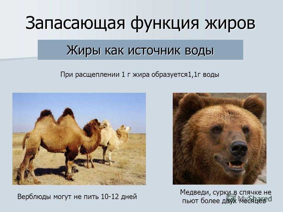 Жиры как источник воды При расщеплении 1 г жира образуется 1,1 г воды Медведи, сурки в спячке не пьют более двух месяцев Верблюды могут не пить дней Запасающая функция жиров