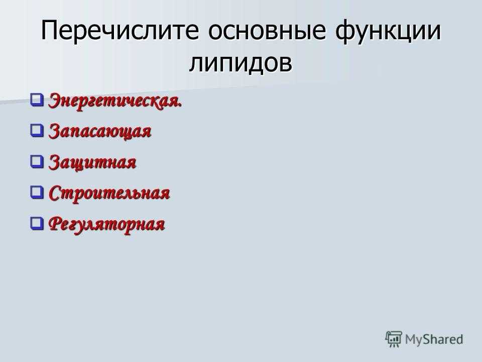Перечислите основные функции липидов Энергетическая. Энергетическая. Запасающая Запасающая Защитная Защитная Строительная Строительная Регуляторная Регуляторная