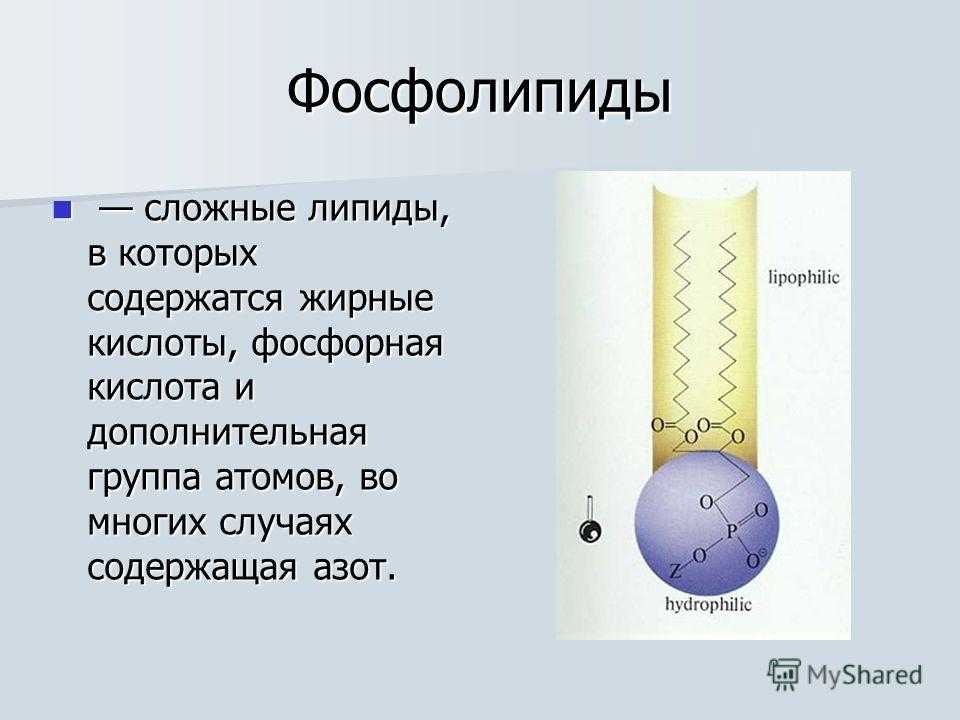 Фосфолипиды сложные липиды, в которых содержатся жирные кислоты, фосфорная кислота и дополнительная группа атомов, во многих случаях содержащая азот. сложные липиды, в которых содержатся жирные кислоты, фосфорная кислота и дополнительная группа атомов, во многих случаях содержащая азот.