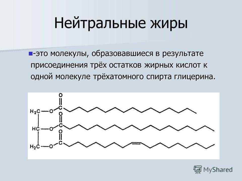 Нейтральные жиры -это молекулы, образовавшиеся в результате -это молекулы, образовавшиеся в результате присоединения трёх остатков жирных кислот к присоединения трёх остатков жирных кислот к одной молекуле трёхатомного спирта глицерина. одной молекуле трёхатомного спирта глицерина.