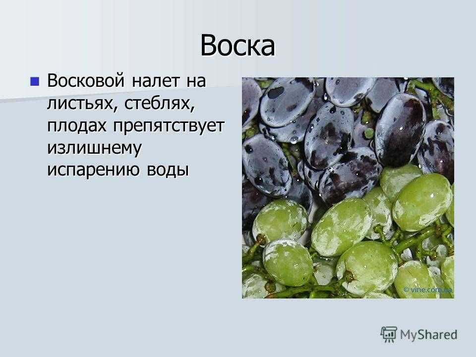 Воска Восковой налет на листьях, стеблях, плодах препятствует излишнему испарению воды Восковой налет на листьях, стеблях, плодах препятствует излишнему испарению воды
