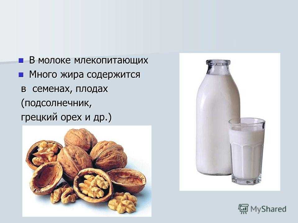 В молоке млекопитающих В молоке млекопитающих Много жира содержится Много жира содержится в семенах, плодах в семенах, плодах (подсолнечник, (подсолнечник, грецкий орех и др.) грецкий орех и др.)