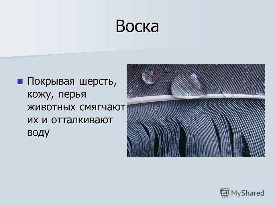 Воска Покрывая шерсть, кожу, перья животных смягчают их и отталкивают воду Покрывая шерсть, кожу, перья животных смягчают их и отталкивают воду
