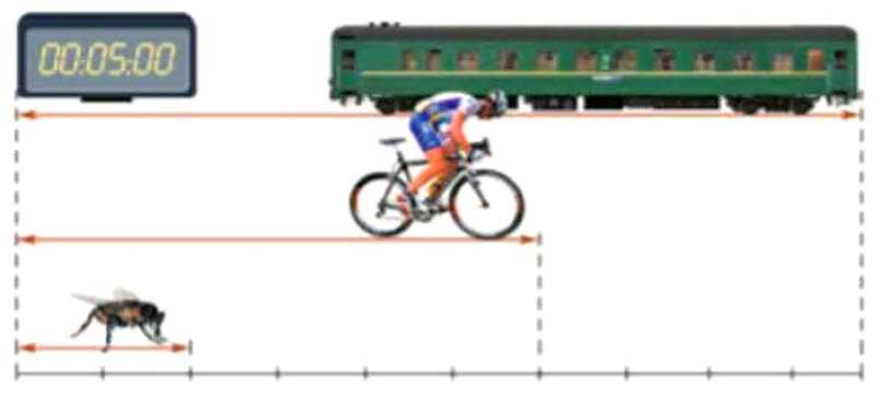 За одно и то же время различные тела могут проходить разные расстояния. За 5 мин движения поезд прошёл большее расстояние, чем проехал велосипедист, а велосипедист большее расстояние, чем пролетела муха. Значит, одно и то же расстояние поезд проезжает быстрее, чем велосипедист, а велосипедист быстрее, чем пролетает муха.
