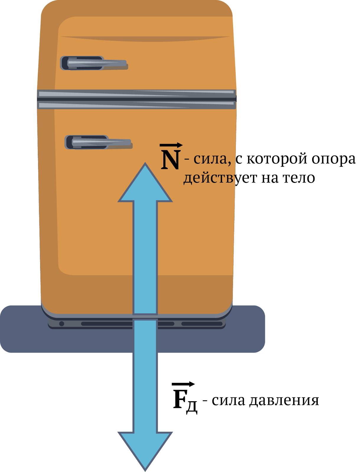 Самое очевидное — его масса играет первостепенную роль. Можно вытащить из него все продукты и тем самым уменьшить его массу, и, следовательно, силу давления холодильника на опору (пол). Пустой холодильник сдвинуть с места гораздо легче!Следовательно, чем меньше сила нормального давления тела на поверхность опоры, тем меньше и сила трения. Опора действует на тело с точно такой же силой, что и тело на опору, только направленной в противоположную сторону.