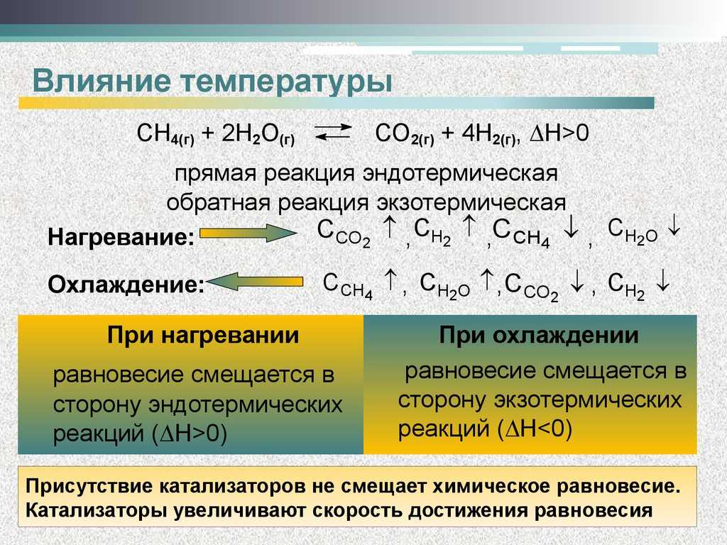 Понижение температуры повлияет на смещениехимического равновесия в сторону продуктов вуравнении:При понижении температуры равновесие в си-стемах, где прямая реакция экзотермическая, сме-щается вправо.